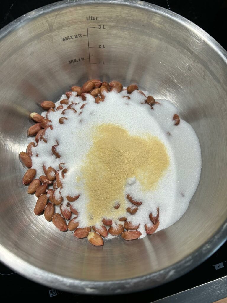 Dans une poêle non Téfal, versez les cacahuètes crues, l’eau, le sucre et un sachet de sucre vanillé. Mélangez légèrement pour bien répartir les ingrédients. - Cuisson lente