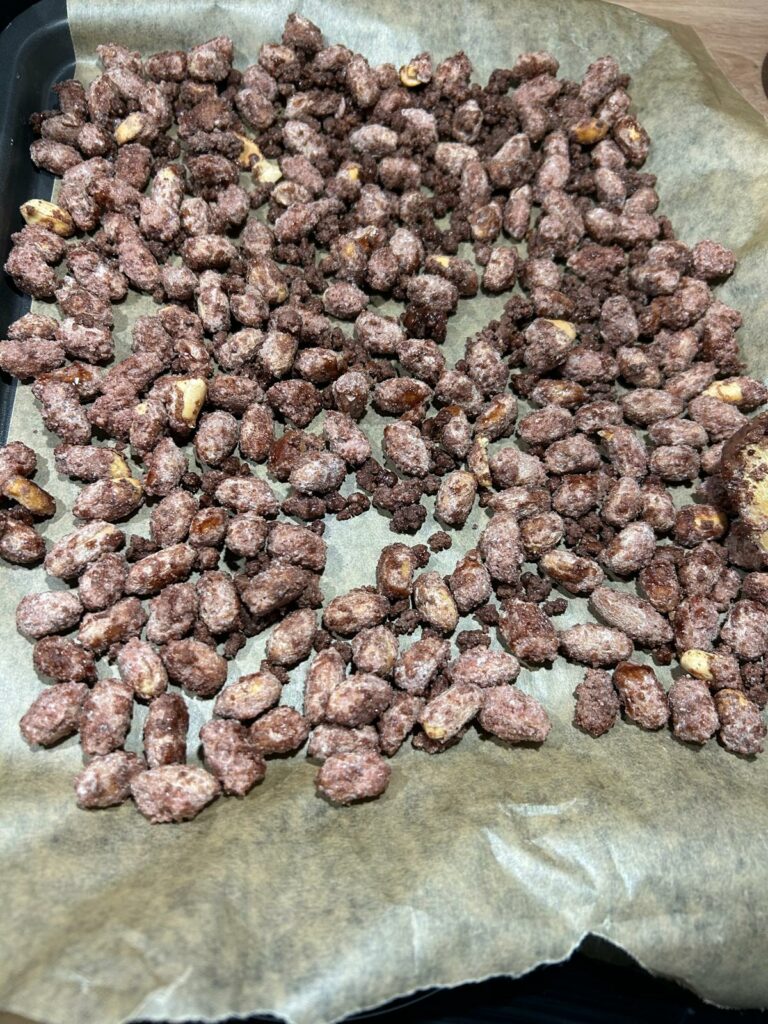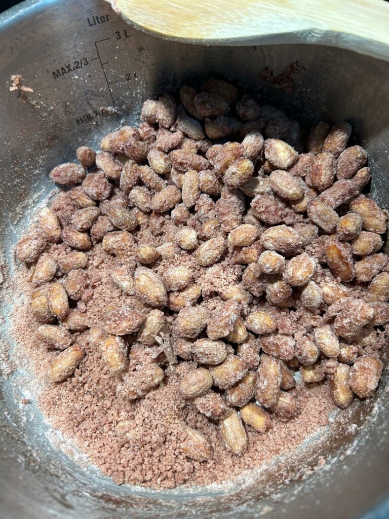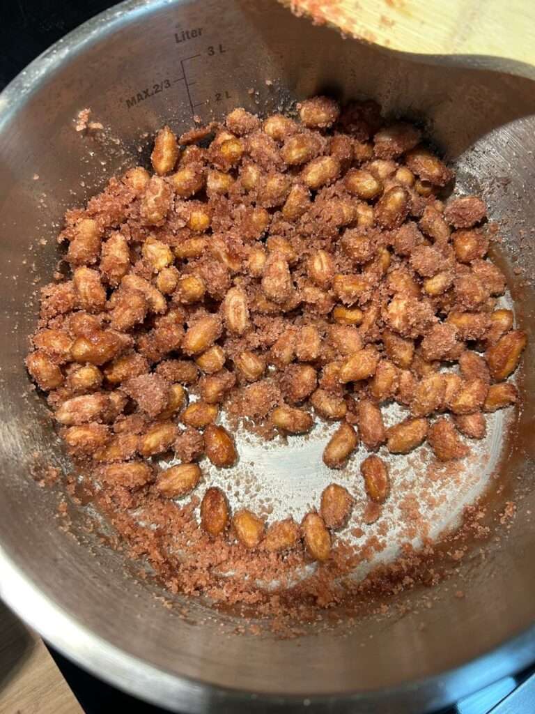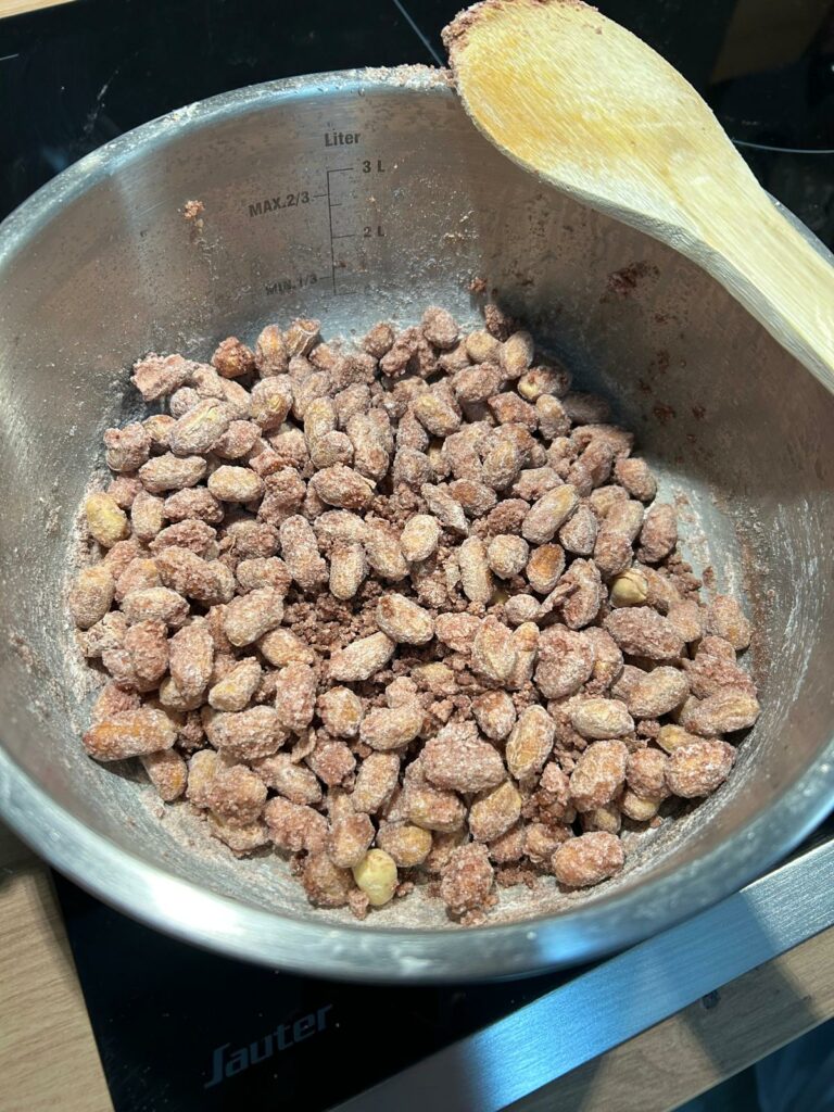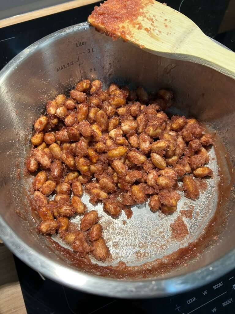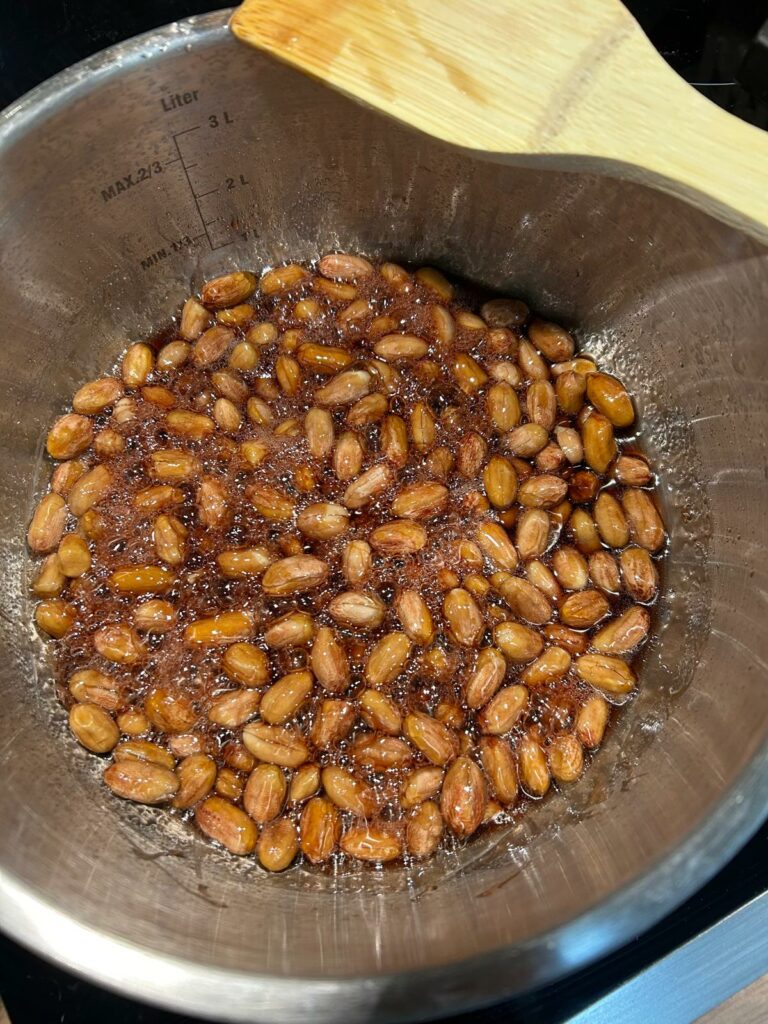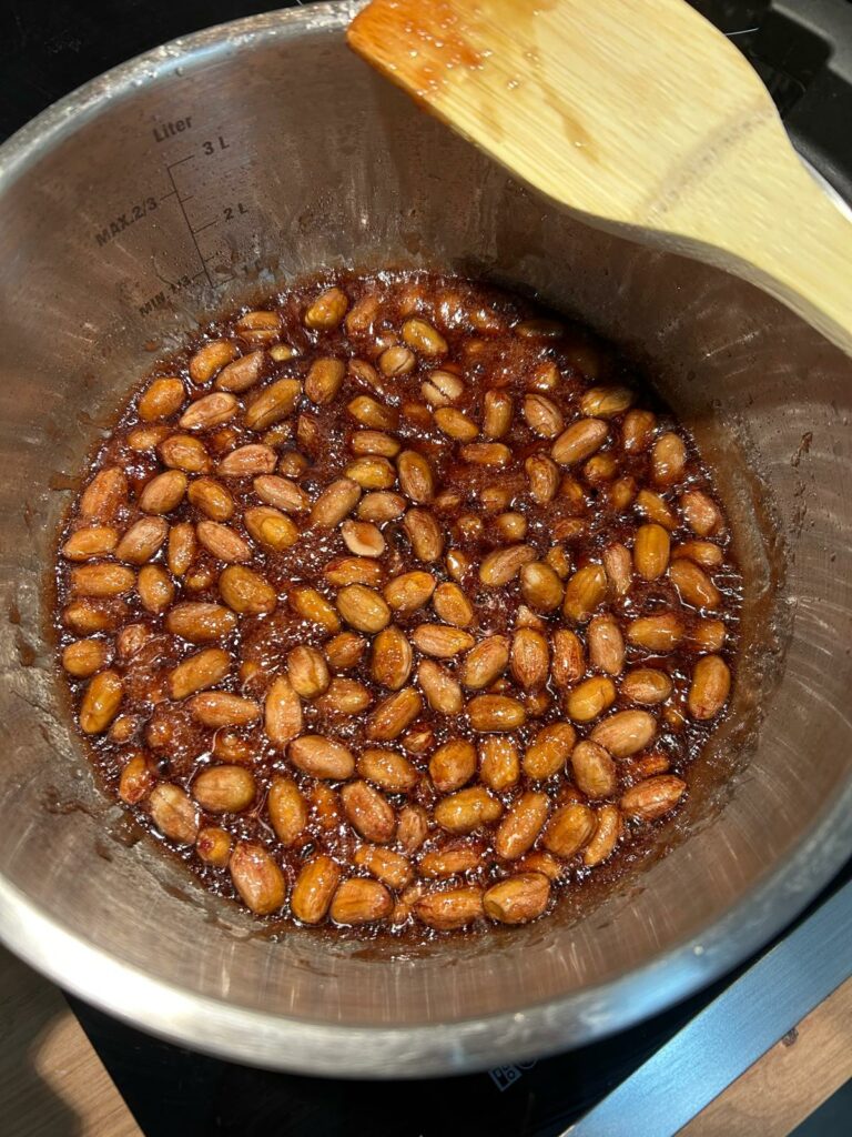 Sans attendre qu’il brunisse trop, mélangez régulièrement pour répartir le caramel autour de chaque cacahuète. C’est cette étape, la plus active, qui donne aux chouchous leur texture brillante et leur goût authentique. - Ajustement vanillé (optionnel)